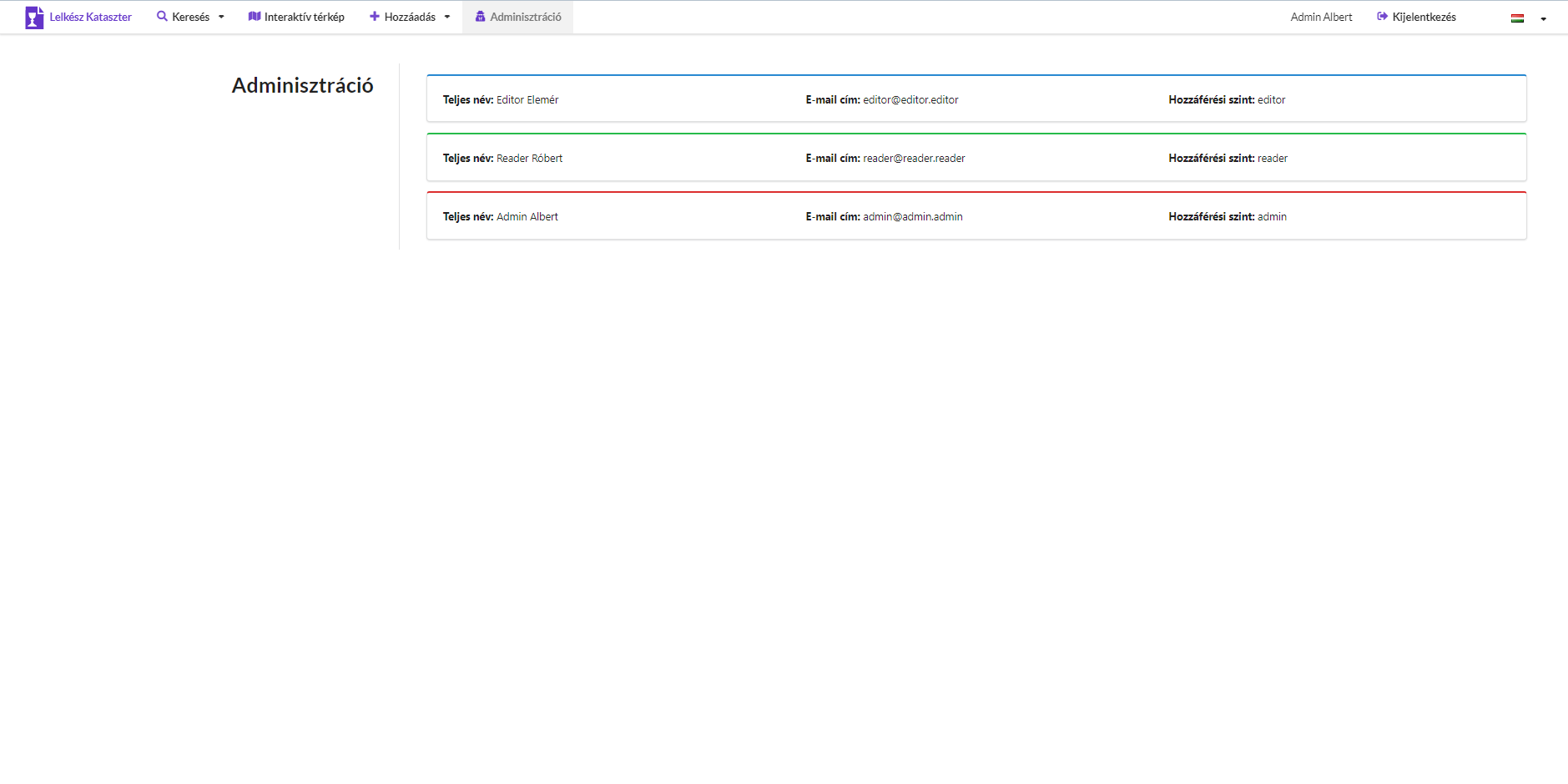 A webalkalmazás zárt körű, regisztráció-elfogadás alapú felhasználó-karbantartó rendszert használ. Be nem jelentkezett felhasználók csak engedélyt kérhetnek regisztrációval, míg egyre magasabb felhasználói szerepkörökkel egyre több funckionalitás érhető el.
